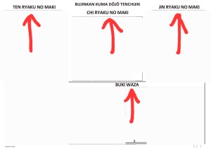The above chart has the entire Ten Chi Jin and Buki Waza syllabus. It is a chart created by our mentor Arnaud Cousergue. I have only shown the headings for reference and hidden the actual forms and techniques, for they have to be learnt in a dojo. Also, I do not own the rights to the above chart.