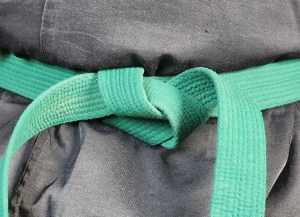 A male student wears a green belt before earning the black belt (while holding the kyu ranks). Female students wear a red belt before the black belt is earned.